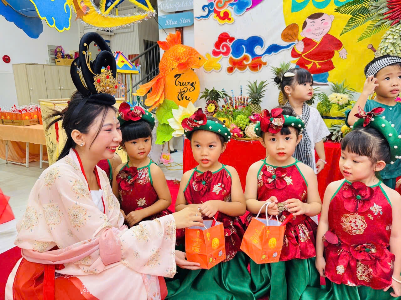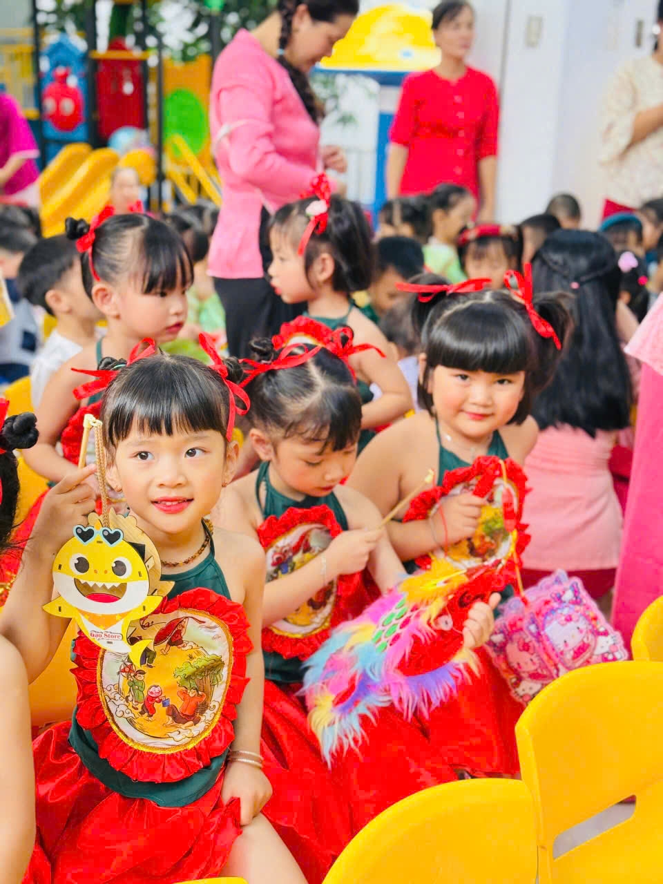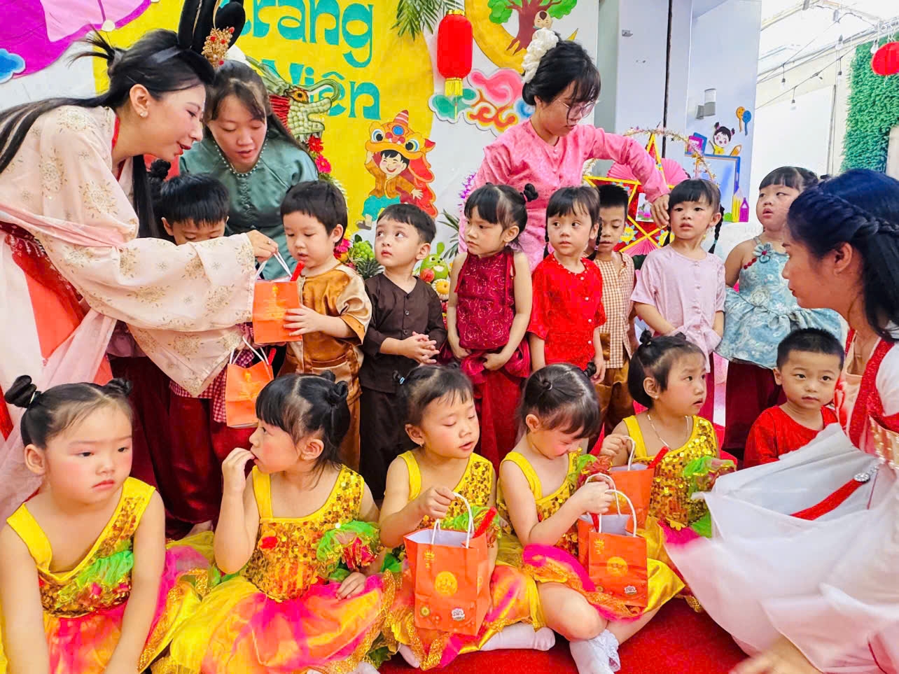 Mở màn chương trình là phần phát quà trung thu, các bạn nhỏ với tâm trạng hào hứng đứng xếp hàng nhận quà từ tay chị Hằng Nga, Chú Cuội và các nàng tiên, phần quà nhỏ đó là những chiếc lục lạc đáng yêu cùng chiếc bánh trung thu lân vàng đã được các cô giáo chuẩn bị sẵn để gửi đến các con. Để góp vui cho chương trình thì các bạn nhỏ cùng cô giáo đã chuẩn bị sẵn và mang đến những tiết mục múa thật sôi động, đáng yêu cùng những điệu nhảy vui tươi khiến sân trường trở nên bừng sáng. Tiếp theo sau là màn múa lân sôi động, tiếng trống vang lên giòn giã, các bạn nhỏ tay cầm chiếc lồng đèn xinh xắn, miệng cười thật tươi cùng đoàn múa lân đi rước lồng đèn xung quanh sân trường. Và sau cùng một khoảnh khắc được mong chờ nhất đó là phá cỗ Trung Thu đã khép lại buổi lễ trong không khí vui tươi, ấm áp và đầy ắp tình yêu thương.